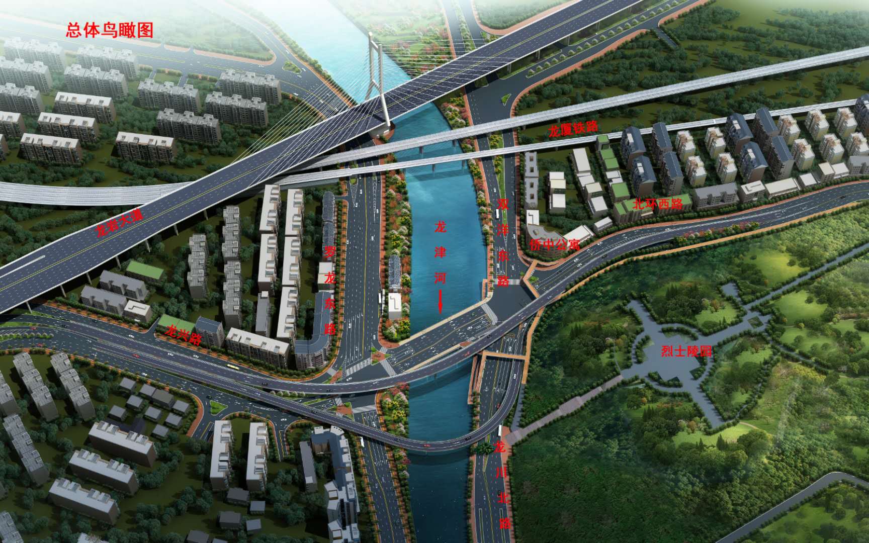 沿北環(huán)西路、龍興路設(shè)置南北分離式雙向四車(chē)道高架,南側(cè)接龍興路,北側(cè)接現(xiàn)狀北環(huán)西路,高架靠東側(cè)布置(緊貼烈士陵園),橋梁總長(zhǎng)約1140米,凈寬約7.7米;在雙洋路、龍川北路、北環(huán)西路設(shè)置人行天橋,與山體步道銜接,以完善慢行系統(tǒng);在烈士陵園山體下采用明挖回填方式設(shè)置框涵,長(zhǎng)度約225米,凈寬10.75米。