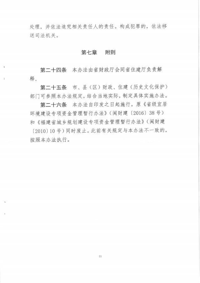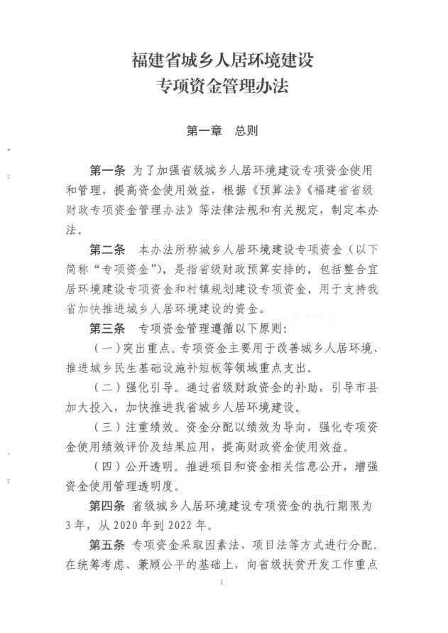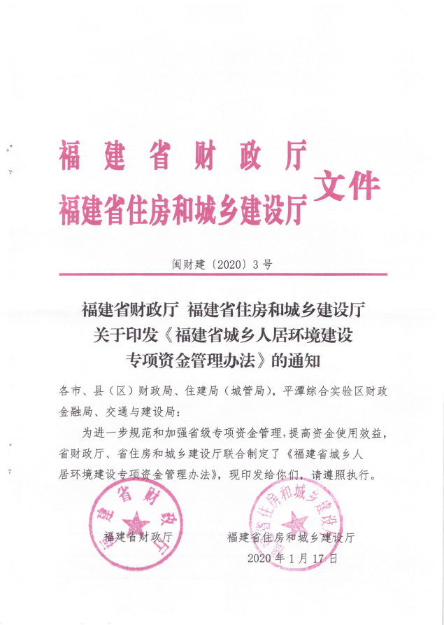 福建省財(cái)政廳福建省住房和城鄉(xiāng)建設(shè)廳關(guān)于印發(fā)《福建省城鄉(xiāng)人居環(huán)境建設(shè)專項(xiàng)資金管理辦法的通知》(閩財(cái)建[2020]3號)